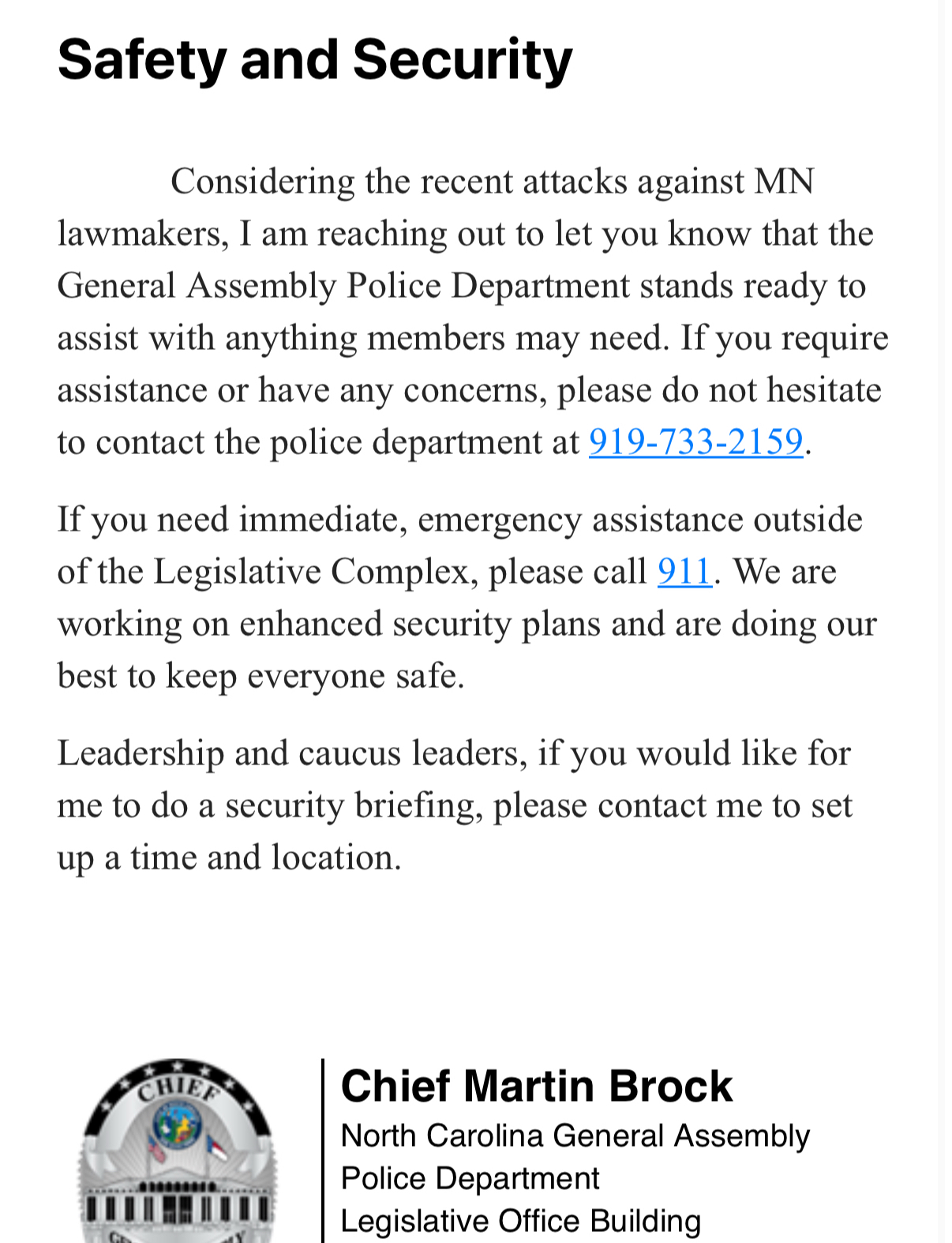In an email to lawmakers on Monday afternoon, General Assembly Police Chief Martin Brock said his department is “working on enhanced security plans” to keep members safe. When reached for comment, Brock declined to elaborate on what those protocols might look like, citing security concerns.